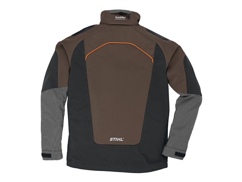 Velmi elastická, rychlé schnoucí a účinně chránící proti chladu. Zóny v černé barvě jsou vodoodpudivé a snadno prostupné pro vzduch, barevné zóny jsou vodotěsné. Ochrana proti odření na ramenou. Barva černá v kombinaci s výstražnou oranžovou/hnědou. Náprsní, vnitřní a ramenní kapsa, reflexní prvky a velké logo STIHL na zadní straně.