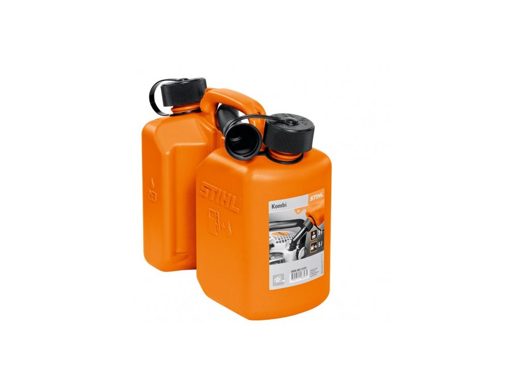 Malý dvojitý kanystr na 3 l paliva a 1,5 l adhezního oleje pro pilový řetěz. S registrací UN, včetně vypouštěcích trubek, kanystr vhodný pro plnicí systémy STIHL.